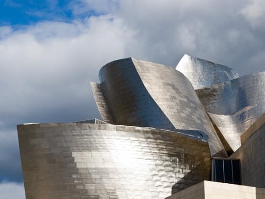 Another picture of the Guggenheim. The upper pieces of the building—what do you call them, battlements?—blend nicely with the clouds. One of the locals claimed it rains every day in Bilbao. But the sun comes out too.