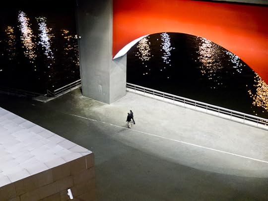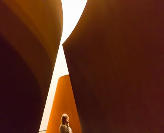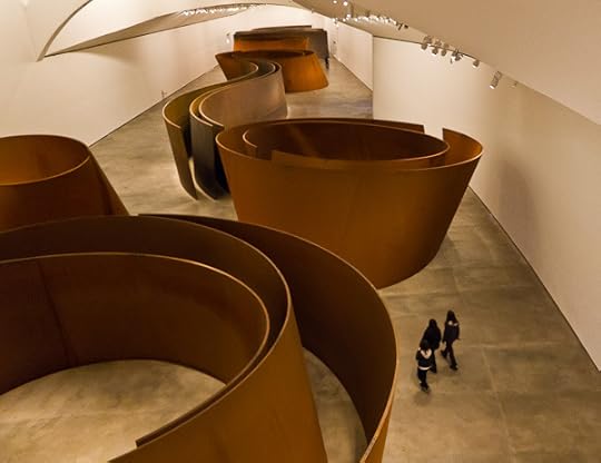 Here's the red arch at night with people walking along the river below. Gehry ran a long exhibition hall out of the museum that runs under the bridge and holds this collection of really enormous Richard Serra sculptures, a suite called "The Matter of Time."