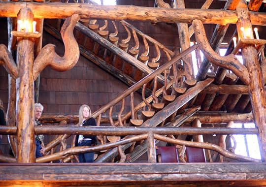 [The awesomely gnarly staircase in the Old Faithful Lodge.]
