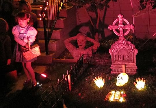 On Halloween, Sylvia and I went walking on Tate Avenue in Los Gatos, which has come, over the years, to be a really popular holiday street. The people who live there go all out with the decorations, and ton of trick-or-treaters turn up. Dig this light-up zombie rising from the grave as a little girl darts past.