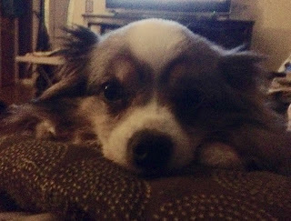 For the next 6 weeks, he grew increasingly worse, and the vet kept increasing his meds. It was so hard to see him suffer and not be able to do anything to really help him. He would constantly come to me for comfort when he got afraid, as if somehow I could make his suffering go away. I took the picture here on the right during one of those times. For some reason, my efforts to love and comfort him did seem to help temporarily. His face would brighten right up, and his little doggy smile would return.