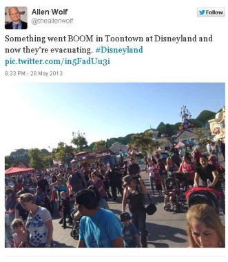 Security personnel soon appeared and asked us to leave the area. Before I slide my computer into my bag, I tweeted, “Something went BOOM in Toontown at Disneyland and now they’re evacuating.” There was a tenseness as employees ushered us from the area while security personnel formed a wall between us and a set of trashcans next to the parked trolley. Taking a few pictures of the fleeing crowds, I posted them on my Twitter account. I had been to Disneyland hundreds of times but had never experienced something like that.