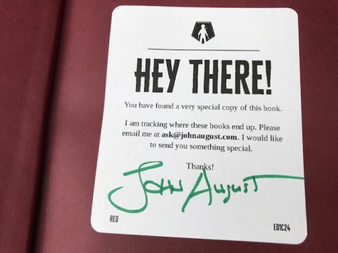 I started reading Arlo Finch on Kindle soon after it was released. After hearing the podcast, however, I was also interested in seeing how the physical copy looked, so I reserved a print copy at three local libraries. I got a notice that one of the books had arrived. When I pulled it off the shelf, I opened it up to discover… the special sticker! Inside the front cover was a message signed by John August that read, “Hey there! You have found a very special copy of this book. I am tracking where these books end up. Please email me at info@johnaugust.com. I would like to send you something special. Thanks!”