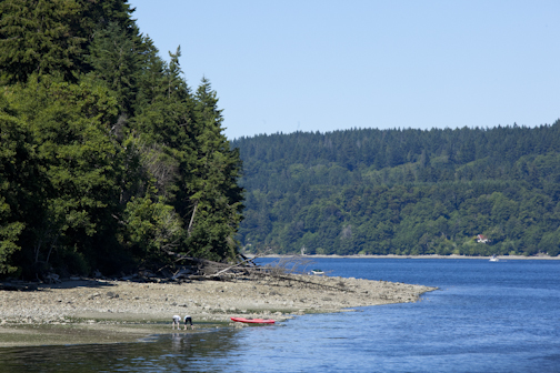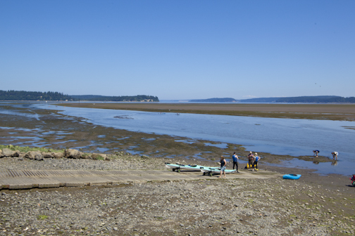 From Quilcene, launch from the Herb Beck Marina south of town, or from the Pt Whitney Shellfish Labs beach. The Pt Whitney beach is strewn with oysters. I once saw a guy trying to get in his newly built wood strip kayak in a few feet of water to avoid scratching the hull. Another method is to bring along those foam pool noodles to launch on if this is an issue for you. I'd recommend booties or shoes while walking on the beach.