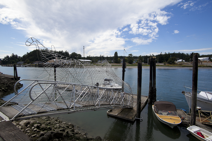 The image below of the wire fish sculpture is in the town of La Connor. We couldn't find any info on whether it's ok to launch there. The current rips through there on big exchanges and it's most often used by commercial fishermen.