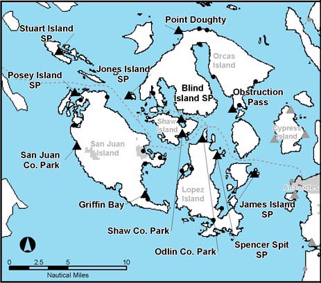 The Cascadia Marine Trail, one of the more popular water trails of the WWTA includes over 140 miles of water from Olympia to the Canadian boarder. By becoming a member (starts at $35 a year), you can have access to their online maps, travel info and details regarding each site. Below is a the page for the San Juan Islands. The triangles are the WWTA campsites for the region.