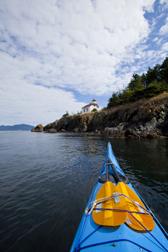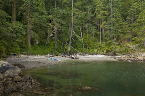 On the eastern shore, there's a Cascadia Marine Water Trail site with one of the best outhouses around. The campsite is perched 20 feet above the little protected cove well protected from southerly and northerly winds. A lighthouse is on the western shore above the water on a rocky cliff. You can land there in the rocky nook on the north side of the lighthouse.