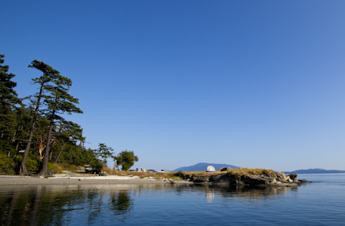 You'll experience the most current approaching from Deception Pass or Cornet Bay. Time the currents for the flood and flow through the Pass or east of Cornet for a free ride nearly to the islands. Ala Spit is the easiest access to Hope, with only a few hundred yard crossing to the island. There's a Cascadia Marine Trail campsite (pictured) on Ala Spit.