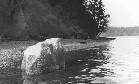 Possibly the most interesting erratic is Haleelts Rock on the north end of Bainbridge Island which has a petroglyph on it's north facing side. See pic below.