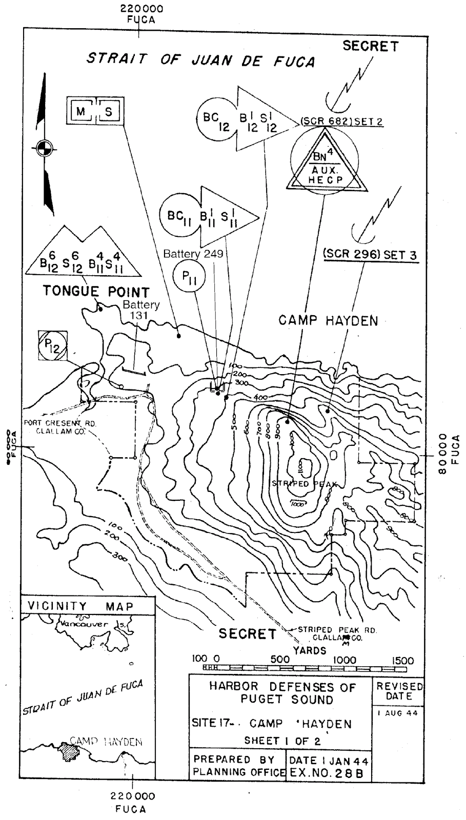Some are on private land and a few are in DNR areas. The largest and most public emplacements on the Strait are at Camp Hayden (Salt Creek) where visitors can drive through Battery 131 which once employed two 16" cannons. These were fired once, but a turn of events in the Pacific War led the installments to become quickly outdated. Nearby, a battery of two 6" guns on Striped Peak can be easily accessed by a dirt road above the ranger station. Other fire control stations (slit bunkers) can be seen by the tent camping area and hidden in thick foliage on Striped Peak.
