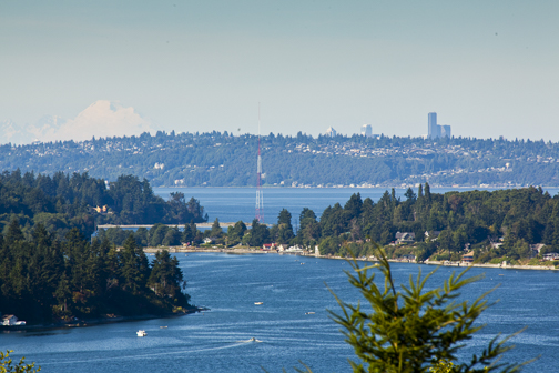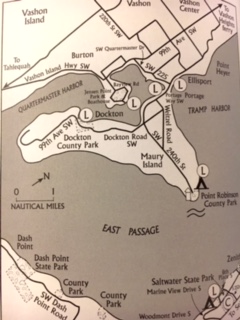 Portage from Maury Island, Seattle & Mt Rainier in backgrounIf you're paddling down Puget Sound from Seattle to Vashon Island, there's a long way around Maury Island, (SE Vashon) and a short way. The long way is over 8 miles from Tramp Harbor to the south tip of the island.By portaging from Tramp Harbor over Portage, a narrow isthmus separating Vashon Island from Maury Island, the route through Quartermaster Harbor is only 4 miles in protected water.