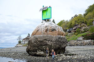 Many erratic boulders line the shores of Puget Sound. Some large erratics can be found in Seattle such as 4 Mile Rock off the south side of Magnolia and this one below off North Beach of Discovery Park. Read more about erratic boulders (source: NW Geology)