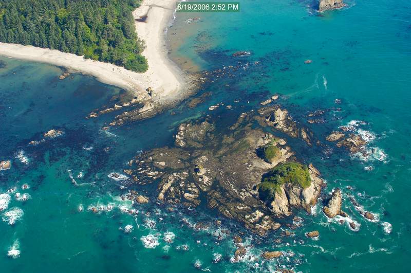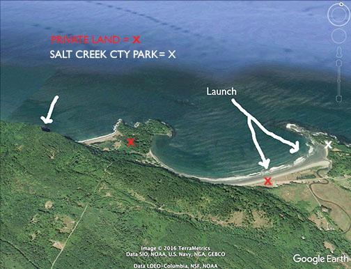 A family owns the beach from the west side of Salt Creek to the Crescent Beach RV Park, to the west side of Agate Point. Much of this trip was private property, so even if it was calm, I'd be reluctant to land and explore further. Note that the family is very serious about trespassing and will try to prosecute you if you resist. I've seen it before with surfers and once chatted to a local Sheriff officer who responded a call regarding trespassing. A decade ago, a friend and I landed on their beach in heavy seas and high wind for our own safety. A woman came out and yelled at us and followed us, taking our license plates #'s (in the public lot) down threatening us with criminal trespassing. In summer a man will watch kids in Salt Creek (huh?) and direct them to the country park side of the creek. One advantage to the family owning the bay is that it's keeping it from being developed.