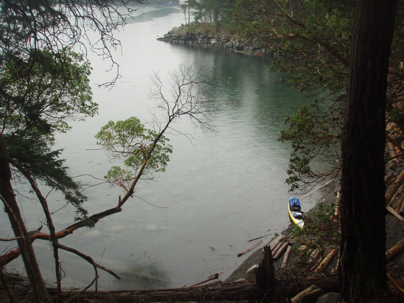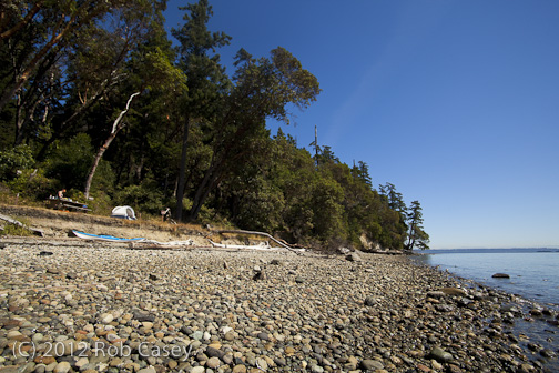 There's three campsites for paddlers on the island. The WWTA Cascadia Marine Trail site is on the NW side, the 'primitive' site on the south side (our favorite), and in Tilikum Village on the northeast side. There's a great surf break there south of the marina for freighter and wind waves. I surfed it one day for 1 hour scoring on waist high peelers.