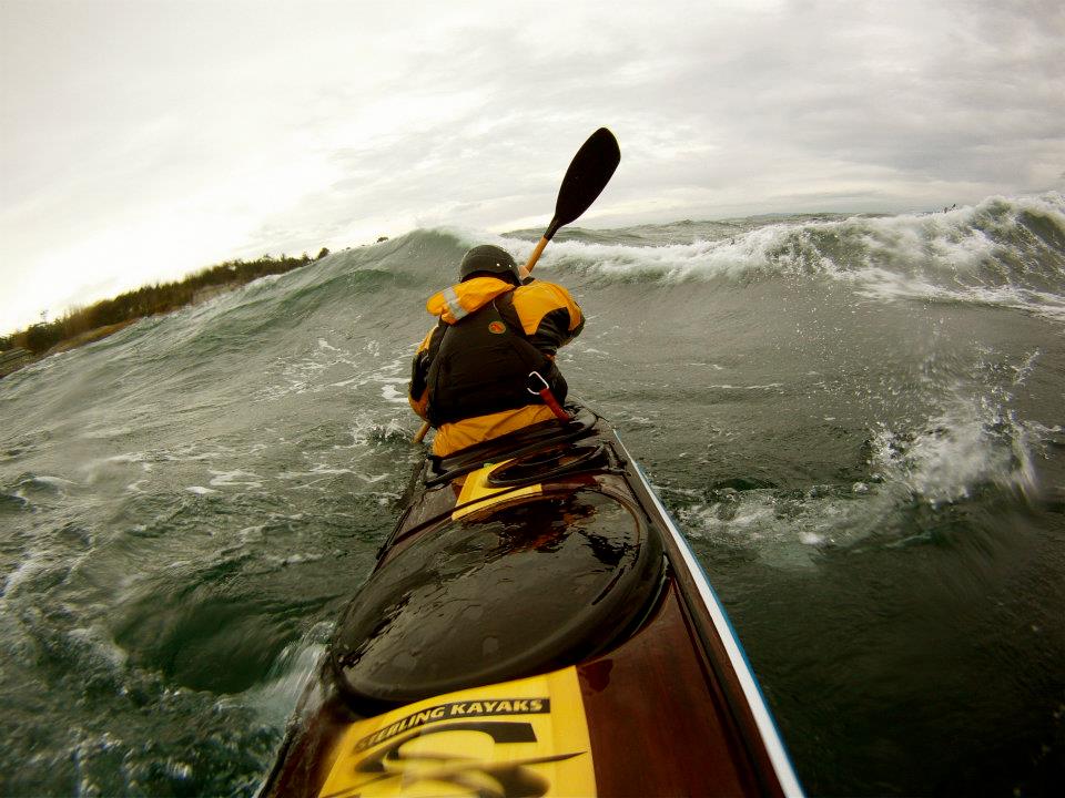 Tucked between the Chatham Islands and Ten Mile Point northeast of Victoria BC lies Baynes Channel. The Channel can get up to 6 knots of tidal current making for a fast moving tidal race. Here Victoria based paddler Rowan Gloag is seen paddling the Channel in mid November, 2012.