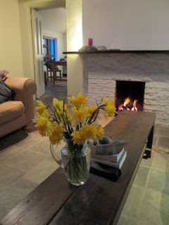 Today is Pancake Day - Shrove Tuesday, the last day before Ash Wednesday, the first day of Lent. The fire is still needed in the evenings, but a bunch of daffodils, carried up from Jack's, fills the house with scent.