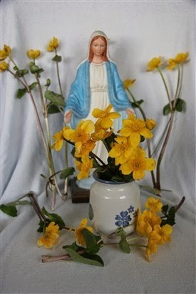 I remember the May altars of my Dublin childhood, smothered in flowers and decked in starched linen. They were great fun to create and produced annual entertainment in the low rivalry between a girl in the Middle Back, who had access to apple blossom, and someone else in the Top Front, whose granny hoarded tray cloths made of white crochet lace. (Our school was in a Georgian terrace so the classrooms were named accordingly; two on each floor, with the loo and stationary cupboard on the first landing and a 1950s drill hall at the bottom of the garden.)