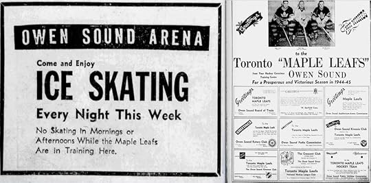Most of the team arrived in Owen Sound by train from Toronto on the afternoon of October 10, 1944. Others would trickle in over the next few days. The players were put up in a couple of hotels around town, had access to a local gym, held practice in the Arena, and played golf on a local course. Coach Day, trainer Tim Daly, star player Babe Pratt and a few others took part in a radio broadcast on CFOS on Friday night, October 20 from the Paterson House hotel, where most of the team was staying. During their two weeks in Owen Sound, the presence of Toronto’s NHL stars gave the Sun-Times something else to report on other than the War news that filled almost every other page.