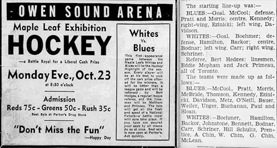 The Leafs played just one preseason game in Owen Sound on October 23, 1944. It was an inter-squad game featuring a Blue team against White. The Blues won the game before an overflow crowd while a storm raged outside. “From the windows could be seen flashes of brilliant lightning,” the Sun-Times reported the following day, “and during lulls in the cheering could be heard peals of thunder and the sound of [heavy rain] pouring on the roof.”