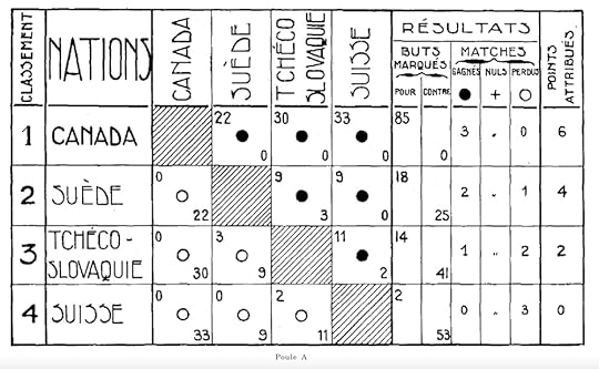 In Pool B, the 7-5 win by France over Belguim was the only close game.A story told in the Globe the day after the team returned home to Toronto gives an idea of just how easy those three victories were. Apparently, in the first period of the game against Switzerland, a photographer jumped onto the ice and dashed over to Ernie Collett. He told the goalie he’d like to take a few pictures as soon as he was at his leisure.
