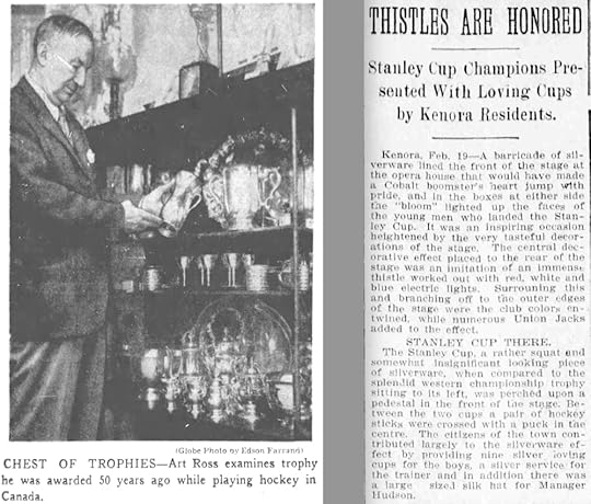 Art Ross showed off his loving cup from Kenora in the Boston Globe on December 23, 1956. The article on the right is from the Winnipeg Tribune on February 19, 1907.After the celebration, the Stanley Cup was displayed for the whole town to see in the window of Johnson’s Pharmacy, the Main Street drug store owned and operated by Thistles president Joseph Johnson and his brother Lowry. But by the time the Cup arrived in town, it was already becoming clear that the team’s defence of the prized trophy was going to be difficult.