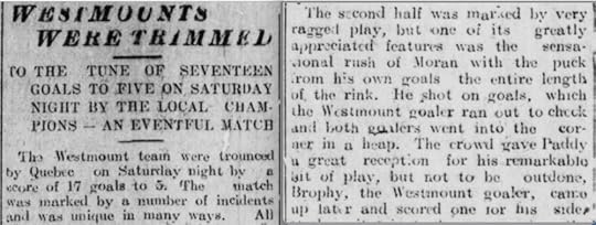 The Quebec Chronicle (courtesy of Marc Durand) has a pretty thorough account.The English-language accounts I’d seen had made it pretty clear that Paddy Moran had tried to score before Brophy did, and that there were a lot of penalties called in a very one-sided game that Quebec won 17–5. As Marc explained, the score was already 12–4 Quebec at the time, and it was getting to be late in the game. According to his translation: