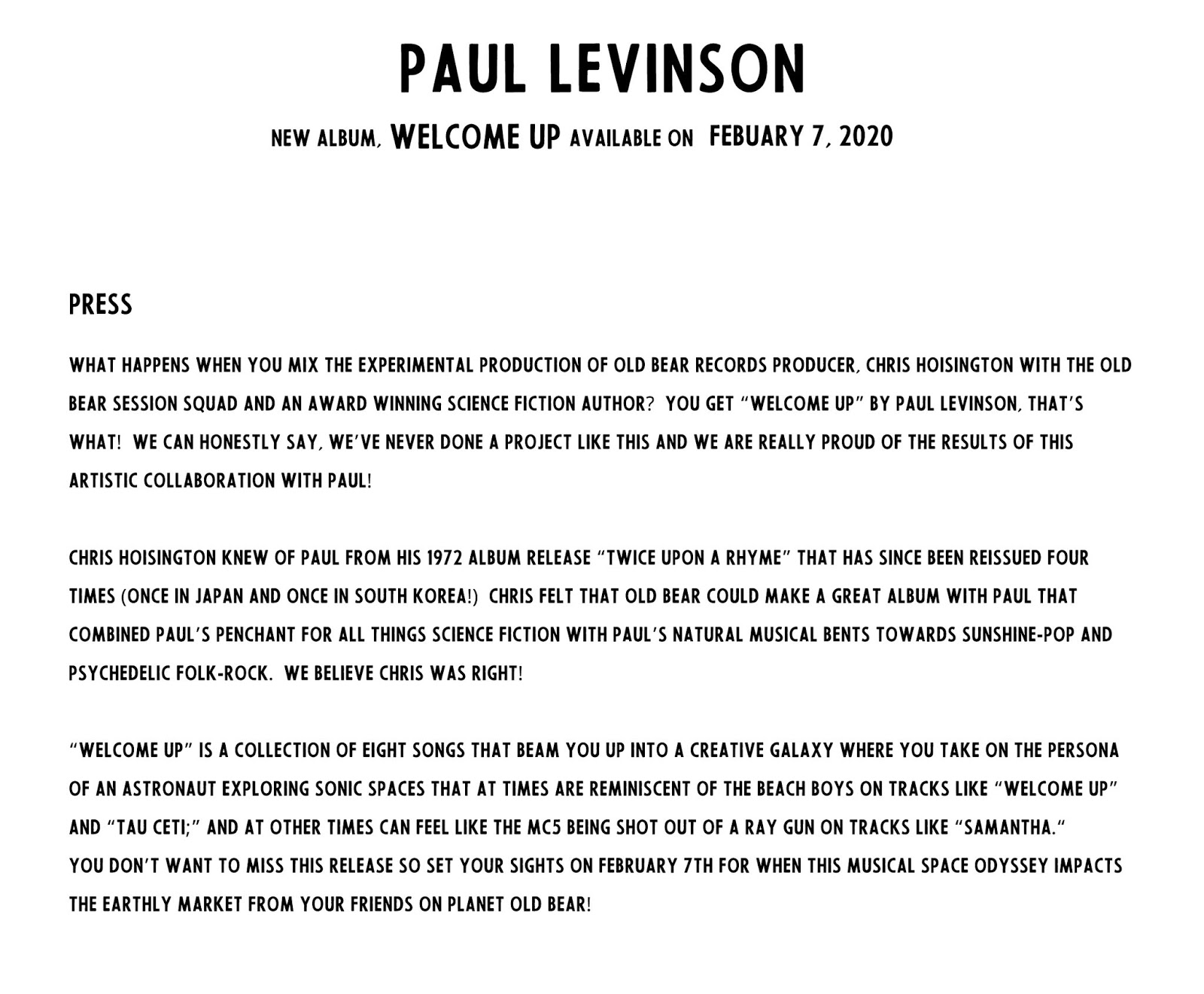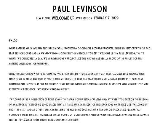 Happy Chanukah, Merry Christmas, Happy New Year! My new LP Welcome Up: Songs of Space and Time -- my first new album since Twice Upon A Rhyme in 1972 -- is almost here!