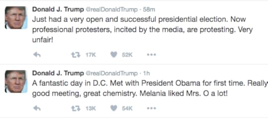 Didn't take long. Those two tweets by Trump say it all. Anyone who was hoping that being elected President might have changed him, now has an answer: it hasn't.