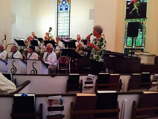 Well, here's something you never expected: Apropos McLuhan's hot and cool, Tina and I went to see Sentimental Journey, a big band, play for about an hour at the First Congregational Church in Harwich on Cape Cod tonight. Bob Cormier, who joined the band in just last year or two and plays trombone, invited us to the performance. Bob and his wife Sue have a cottage not far from ours on Cape Cod Bay, so we couldn't resist. (We've known each for many years - astute readers may recall a character named Cormier in one of my novels, The Pixel Eye - she asked me to put her name in one of my novels, and I said yes to that, too.)