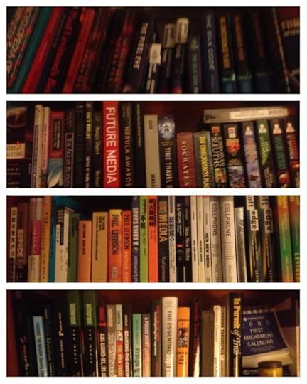 If you click on the shelfie, you'll be taken directly to my Amazon book shelf, where you can buy most of the books in the shelfie - not the foreign translations on the third shelf - and Kindle editions of most of my novels and some of my nonfiction books, as well. And, in the holiday spirit, here's a page with freebies from my fiction and nonfiction, as well as my music. Enjoy!