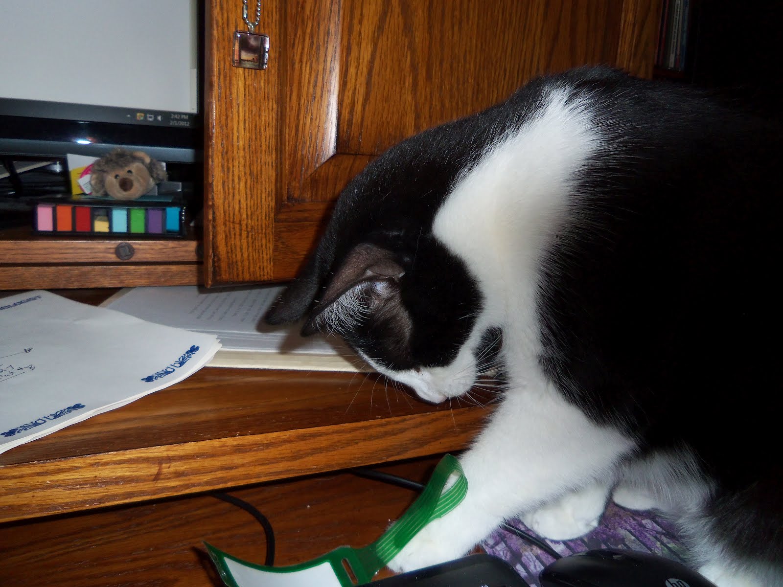 Once Scooter woke me, and I opened the door for him (with an apology for misjudging his motives in making noise), Scooter decided I was awake and therefore it was playtime. I have now taken to hiding my glasses, since he's gotten into the habit of knocking them off the night table at 4:30 AM, as a subtle hint that playtime and/or breakfast should ensue immediately.