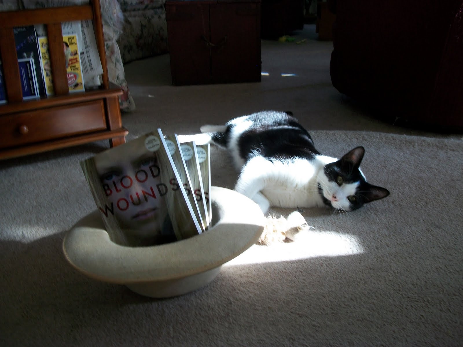 Anyway, if you didn't read yesterday's entry (or admire the extremely cute Scooter picture that went along with it), the gist was I've been sent 4 ARCs of Blood Wounds to share with my blog readers, and if you want a chance at one of them, email me using the address in the upper right corner with the phrase ARC or Blood Wounds or Bolivian Hat or anything else you might think of, between now and Sunday night, and on Monday morning I'll put all the emails of everyone who has asked in my Bolivian hat and pull out four and email those people to ask for their names and addresses and then I'll send them an ARC. Also it doesn't matter where you live, this chance is open to all of you.