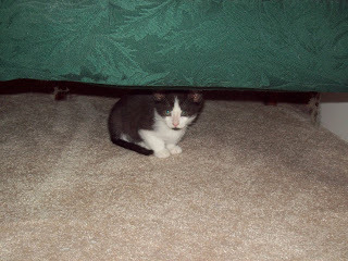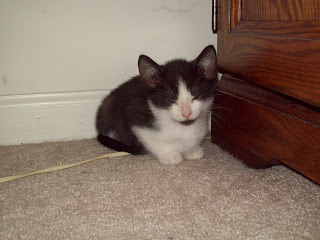 I took Scooter to the vet today, to make sure he was a healthy kitten, and indeed he is. He weighs 1 pound 4 ounces, has a normal temperature, and may be less than 8 weeks old, which would help explain his meowing whenever I'm not right by his side. Although I think he's meowing less (or else it's turning into white noise, I've gotten so accustomed to it).