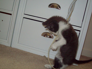 Thus far, he's expressed no interest in food or kitty litter, but he sure does love telephone wires. And my lap.