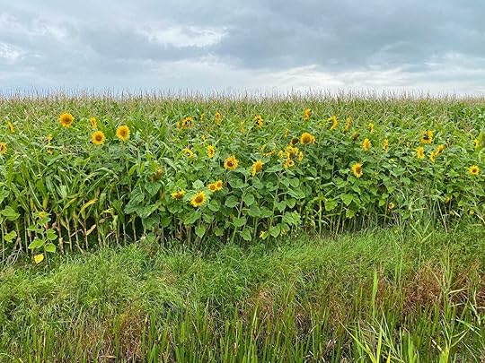 Wandelde onder de paraplu langs verwarde zonnebloemen, hun koppen naar alle kanten gekeerd. Kennelijk geen idee waar hier het licht vandaan komt. In dat opzicht lijken ze op mijn moedertje.