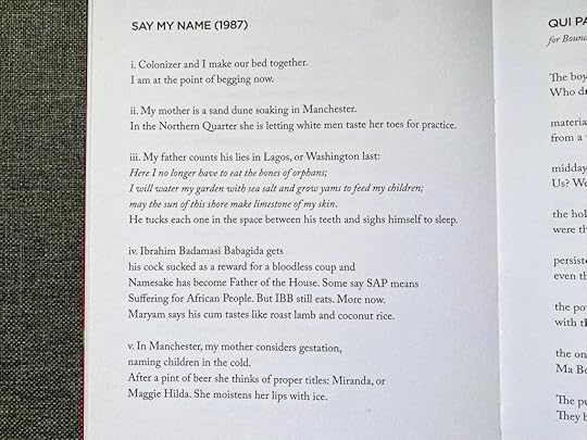 Danladi kwam in de miljoenenstad Lagos ter wereld. Haar geboortejaar, dat ik niet heb kunnen achterhalen, zou het ‘1987’ uit de titel kunnen zijn. Ibrahim Badamasi Babangida was op dat moment dictator van Nigeria. Na een bloedeloze coup in 1985 had hij zichzelf tot president van deze West-Afrikaanse federale republiek uitgeroepen. Babangida was getrouwd met Maryam King, die hem in de vierde strofe ook bedient. Naar aanleiding van de zinsnede ‘Namesake has become Father of the House / Naamgenoot is nestor van de Kamer geworden’ achterhaal ik dat de Nigeriaanse achternaam Babangida ‘father of the house’ zou betekenen en dat de nestor van een politiek bestuursorgaan in het Engels met Father of the House wordt aangeduid. Onder de noemer SAP, Structural Adjustment Program, voerde Babangida met behulp van internationale leningen economische en politieke veranderingen door. Dat niet iedere Nigeriaan van dit programma profiteerde maken de woorden dat ‘sommigen zeggen dat SAP Suffering for African People betekent’ duidelijk. Zou armoede een van de redenen zijn geweest waarom de ik-figuur met haar ouders uit Nigeria is vertrokken? Dat de ik-figuur weinig op heeft met Babangida, die nog altijd leeft, is in elk geval een understatement.