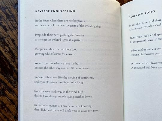 In ‘Reverse engineering’ mijmert een ik-figuur op een nachtelijk uur over het leven in het algemeen en de veroudering in het bijzonder. Naar dit laatste, het verouderingsproces, verwijst de titel van het gedicht. Buiten branden lichtjes.