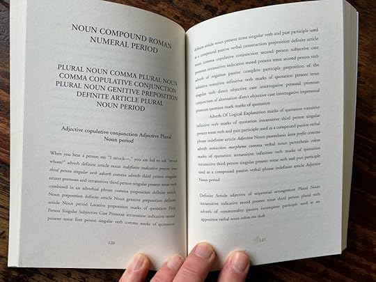 Dworkin heeft met ‘Parse’ een conceptueel gedicht geschreven: het idee erachter is belangrijker dan het werk zelf. Geen zinnig mens leest dit dikke boek uit, je bladert er wat in. Maar het concept vind ik fascinerend. Elke tekst, geschreven of gesproken, kan worden ontleed en in woordsoorten worden overgezet, en elke overzetting zal telkens weer een uniek resultaat opleveren. ‘Parse’ maakt deze mogelijkheid zichtbaar, tastbaar eigenlijk. Bovendien heb ik bewondering voor Dworkins uithoudingsvermogen: de vervaardiging van deze bijna driehonderd bladzijden tellende transcriptie moet monnikenwerk zijn geweest.