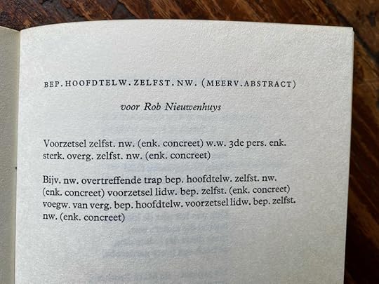 Ik ben een liefhebber van het werk van K. Schippers (1936-2021) en schafte enkele jaren geleden bij een antiquariaat Een klok en profil aan, zijn tweede poëziebundel die in 1965 bij Querido verscheen. Tot mijn verrassing trof ik daar een gedicht aan, waaraan hetzelfde concept ten grondslag ligt als aan Dworkins ‘Parse’. Het heet ‘Bep. hoofdtelw. zelfst. nw. (meerv. abstract)’: