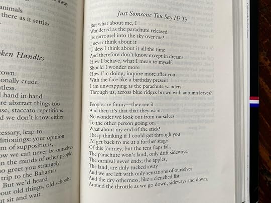 John Ashbery’s gedicht ‘Just Someone You Say Hi To’ is opgenomen in de bundel A Wave, die in 1984 verscheen. ‘Wave’ heeft diverse betekenissen, waaronder golf en wuivend gebaar. Als je iemand van afstand wil groeten, ligt een wuivend gebaar eerder voor de hand dan een luide roep. Bij ‘Just Someone You Say Hi To’ lijkt afstand een belangrijk begrip, de afstand tot de ander en de afstand tot jezelf.