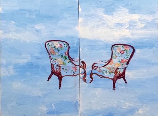 Kwam een schilderij tegen van een jonge Nederlandse kunstenaar dat me beviel. Over zijn werk zegt Muzammil Hussain dat het ‘een onderzoek is naar de menselijke psyche, een fysieke representatie van het onbewuste.’ We zien op het doek twee zwevende doorzichtige stoelen, hoog aan een hemel, beide leeg. Het is een fantasiebeeld, dat de verbeelding prikkelt. Een van die twee lege stoelen is vast voor Petrus, kwam in mijn gedachten op, of voor God.