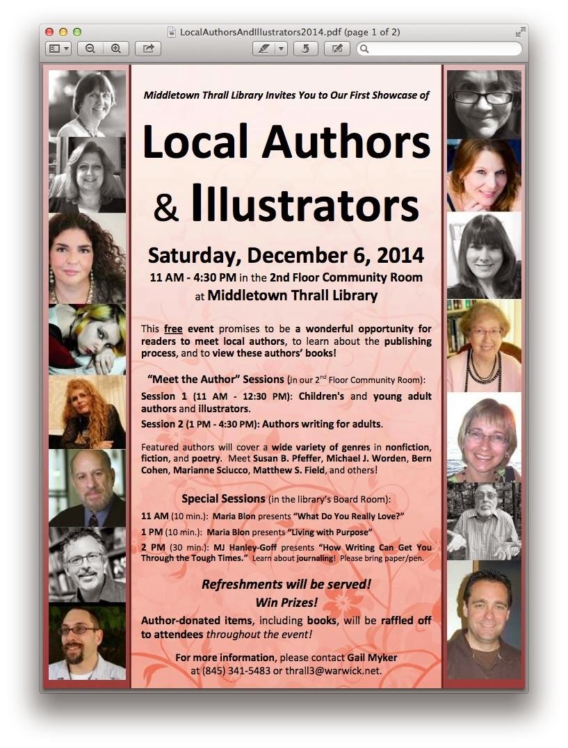 Happy Friday, everyone! If' you're local to the Mid-Hudson Valley, NY, tomorrow (Saturday) there's an author/illustrator event you won't want to miss at Thrall Library in Middletown, NY! The morning session will feature children's and Young Adult authors, and the afternoon will feature adult fiction writers.