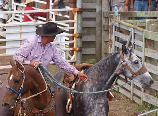 And here's one of my favourite real-life photos - one of the heroes of the rodeo - a pick-up rider here in New Zealand riding one horse and calming another. Definitely inspiration-for-heroes material!