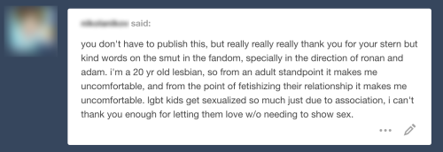Moreover, the general nature of the questions is — they are — how to — let’s just say — They’re explicit, they’re always about the boys or about a poly relationship, never ever about Blue + Gansey, they’re voyeuristic, and all of these things combine to make increasingly me uncomfortable not just as the adult creator of a teen series, but as a person who is keen to promote LGBT relationships as mainstream and not the stuff of sexualized fantasy.
