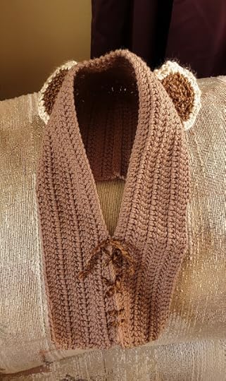 I found a free pattern on Ravelry for the Yub Nub Scoodie. The pattern makes an adult size scoodie, but I found a crocheter who wrote about making one of these for her son. She used worsted weight yarn instead of the chunky weight yarn in the original pattern, and she shortened the length. I did the same, and it turned out well for Staf...