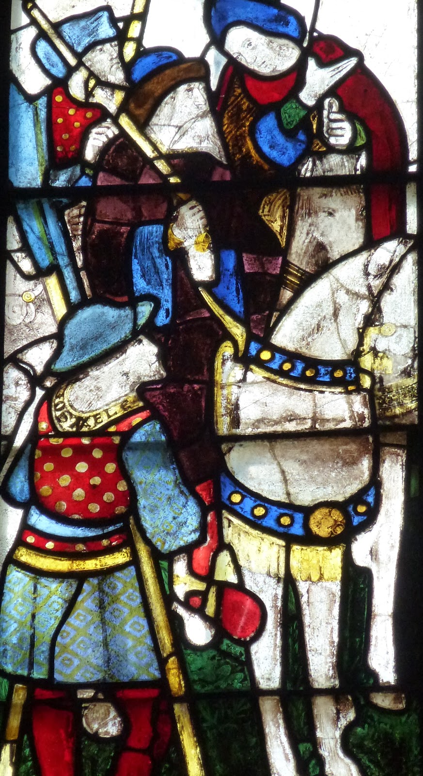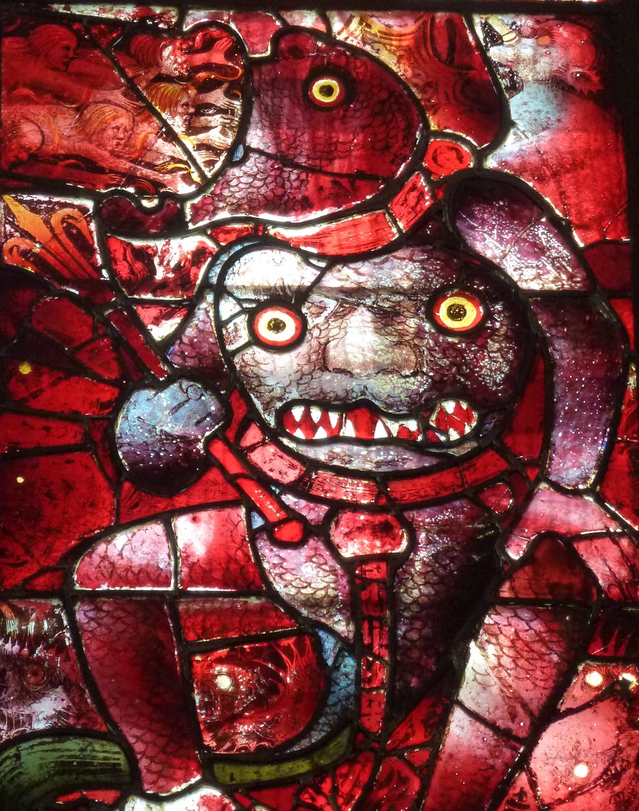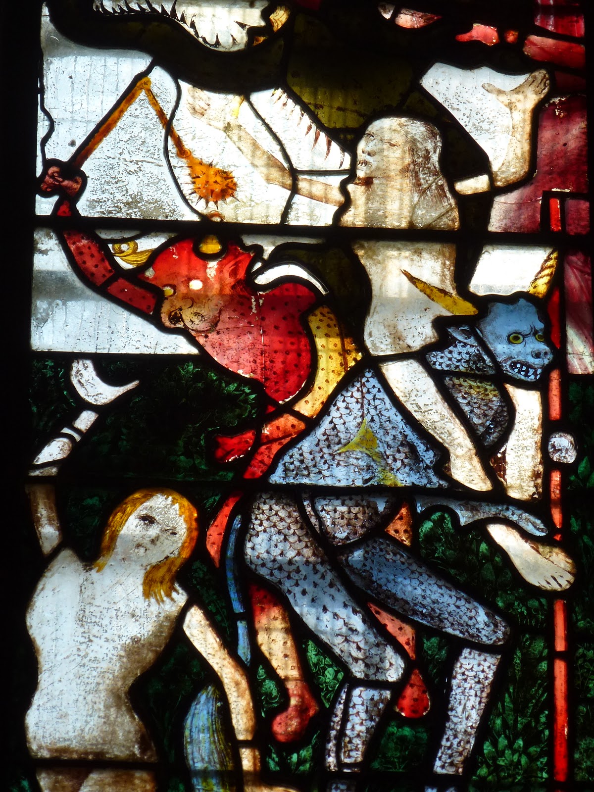 Most extraordinary of all is the west window - the last judgement. The upper half has been replaced by dull Victorian glass, but below, the scene of the weighing of souls - those destined for heaven, those for hell - is quite extraordinary. Whilst the virtuous are whirled up towards the light by piping angels, the sinful are being carried off to hellfire by terrible creatures - green monsters with scaly tales, spotted demons with horns and whips, purple ones hauling their pallid victims away in chains. Their mouths are open in silent horror as they slide down into the flames. It is too late to repent.