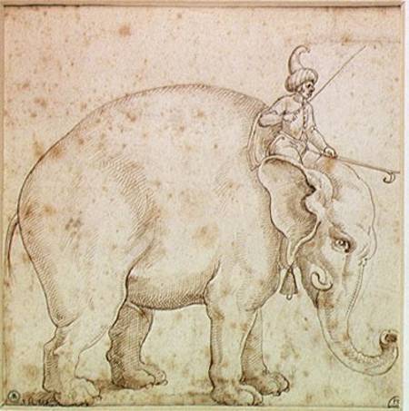 Hanno and his mahoutEven less fortunate was Manuel’s follow-up gift – a rhinoceros – dispatched from Lisbon in a green velvet collar. The ship was wrecked off the coast of Genoa in 1515. The animal drowned and was washed up on the seashore. Its hide was recovered, returned to Lisbon and stuffed. Albrecht Dürer saw a letter describing the stuffed creature, and possibly a sketch. He produced his famous print without ever having seen a rhino – not a bad attempt under the circumstances.
