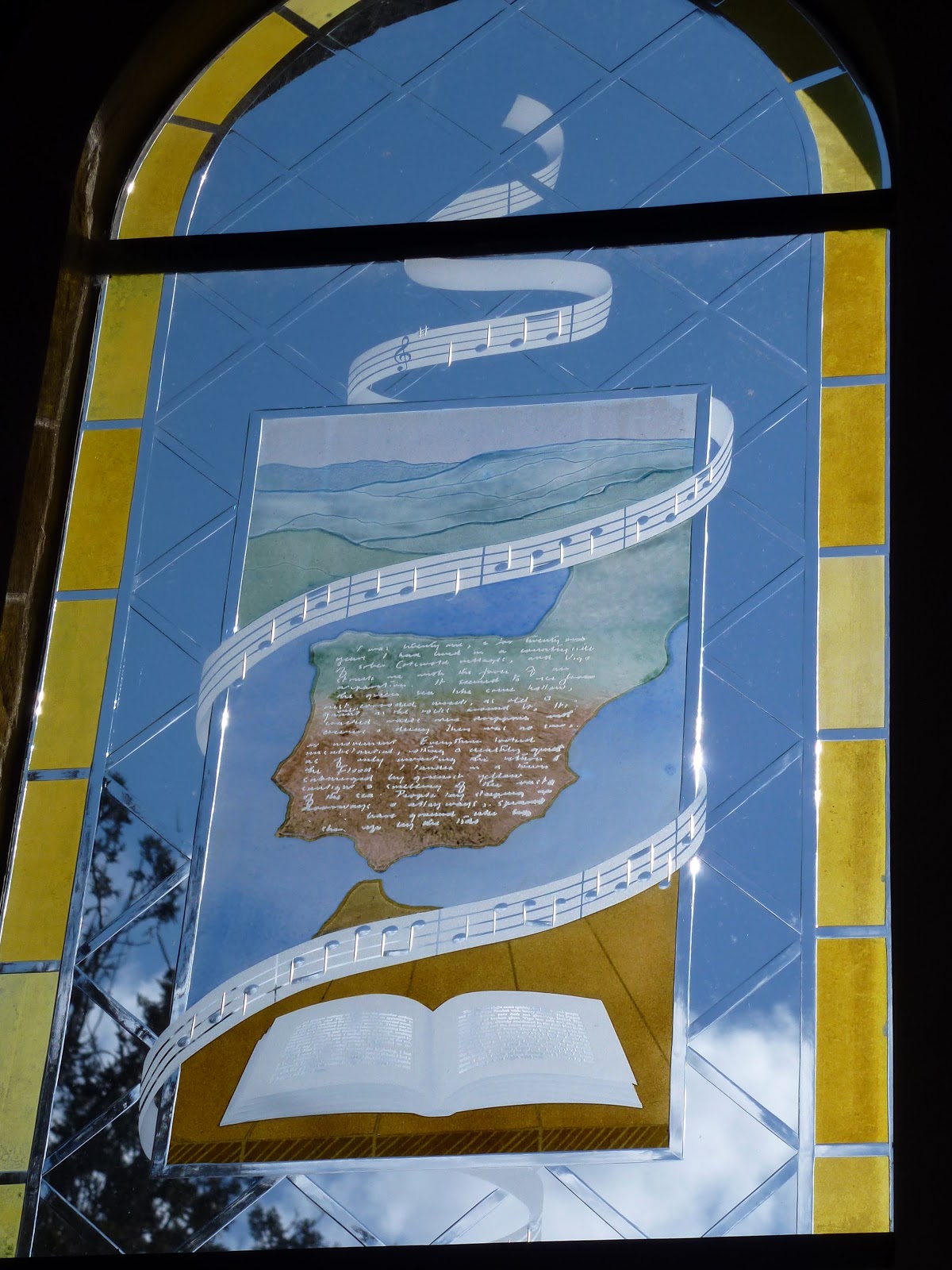 Today – on a blue, sunny, bone-dry, and unseasonably cold Spring morning – I went on a whim to pay my respects to Laurie in the Slad churchyard looking across the road down which he departed that summer day in 1935 to the valley and the hills beyond. Inside the church there are some quite lovely stained glass windows that depict his travels to Spain, his violin and his words.