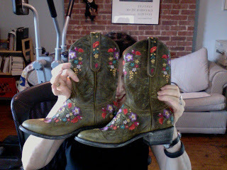 For my tour for Pictures of You, I wanted a talisman. Something to make me feel powerful and confidant and unique. Also, because I was wearing two different slinky black dresses all the time, I needed to stand out. So I got on ebay and found a pair of red cowboy boots and suddenly, the Red Cowboy Boot and Vintage Beaded Cardigan Tour was born! And those red boots? They made me feel powerful. They made me feel like I could conquer the world. And they began to get their own fans. When I was video-taped being interviewed with the amazing Anne Lamott as part of Algonquin Books Bookclub series, one of the first questions someone asked was, "Tell us about the red cowboy boots."
