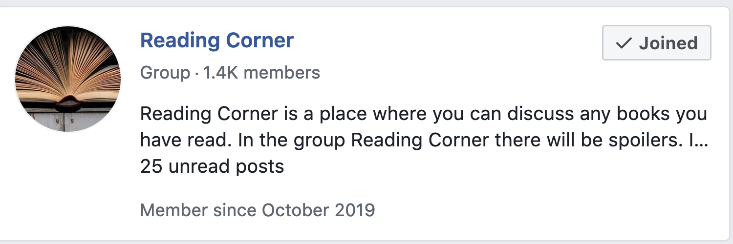 My inspiration for starting Reading Corner can be summed up into three words: love, books, and kindness. I have joined a lot of reading groups on Facebook over the past year and half. The biggest thing I have noticed on a consistent basis is that people are not very friendly or kind to each other in some of these various groups. In some of these groups you can't even discuss books you have read because some people have not read the book. In our group Reading Corner members can discuss any books they like in a safe, caring, loving, and encouraging environment. In Reading Corner we have a monthly book club selection chosen by me. Then either in the middle of the month or at the end of the month we have the author of the book come in and do a live chat to discuss their book. Live Chats are where the author pop in and out throughout the schedule day at their convenience answering members questions or comments about their book. The wonderful thing is some like to do giveaways where they will give one lucky member the chance to win a signed copy of their book. The author will usually just pick at random a person that participated in the live chat that asked a really good question. Finally the day after the Live chat I will post discussion questions to get the group members engaged in a meaningful group discussion about the book. I will post three questions a day for four days.